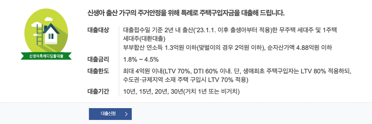 - 신생아 출산 가구의 주거안정을 위해 정부가 지원하는 특례대출